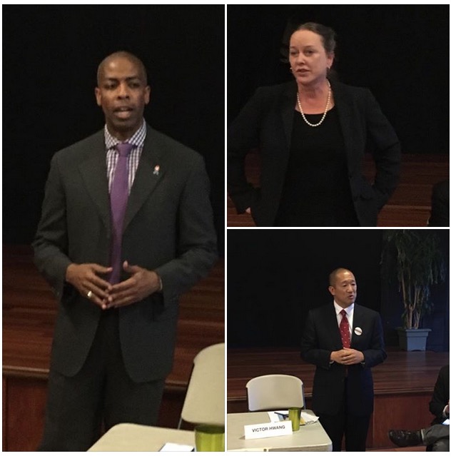 The forum of candidates for Superior Court Judge, Office #7 – Paul Henderson, Victor Hwang, Sigrid Irias (counterclockwise from left, photo by John O’Neill)- was moderated by attorney & PHDC board member J.R. Eppler. Presidential Primary candidates Bernie Sanders and Hillary Clinton were represented by Gustav Feldman and Susan Pfeifer, respectively; presentations and audience Q&A were moderated by PHDC V.P. Tony Kelly.