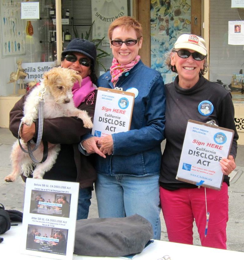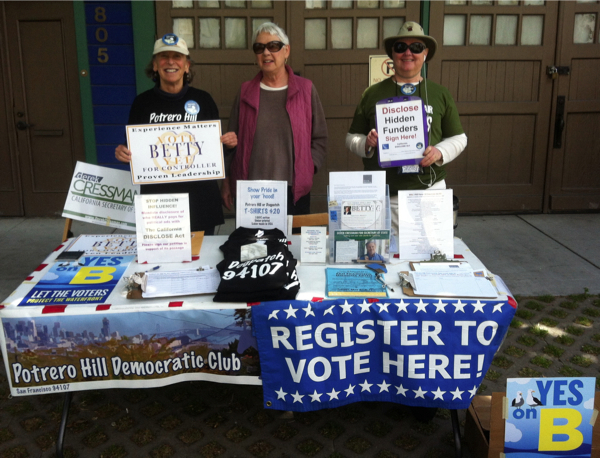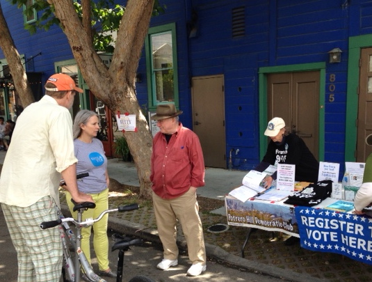 Our July “meeting” took place in Dolores Park on a sizzling Fourth, campaigning for the CA DISCLOSE Act, registering voters, and watching the SF Mime Troupe’s premier performance. Then we were ready to return to our regular venue on the Hill.Bush, Chiu, Herrera, Eppler