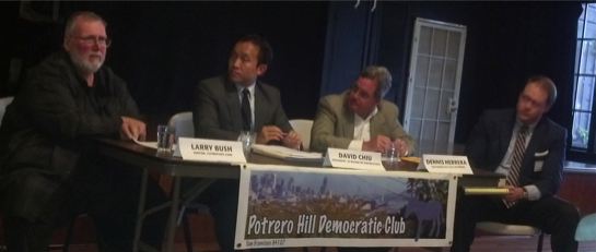 Prop F mini-debateTUESDAY, SEPTEMBER 1st, 6:30pm. Housing and Good-Government night at PHDC. Props A, D, F, I, J, & K (housing) and C & E (good government) were covered. There were mini-debates on the more contentious propositions: D – Mission Rock, former Mayor Art Agnos vs. Jon Golinger; F – Short-Term Residential Rentals, Dale Carlson vs. George Marshall (photo at right); I – Suspension of Market-Rate Development in the Mission, Edwin Lindo vs. Jay Cheng.  Props  A and C, whose only known opposition came from a lone Republican, had opposing arguments presented by PHDC  board members. Props J and K, also apparently opposed by a lone Republican, actually had another Republican show up at the last minute to debate Supervisor David Campos and Fernando Marti respectively. Prop E’s proponent could not appear, so PHDC filled in. Also, District Attorney George Gascon spoke briefly about his tenure and (unopposed) campaign.